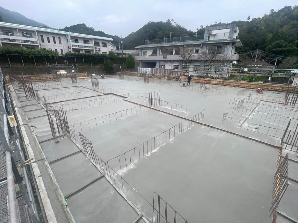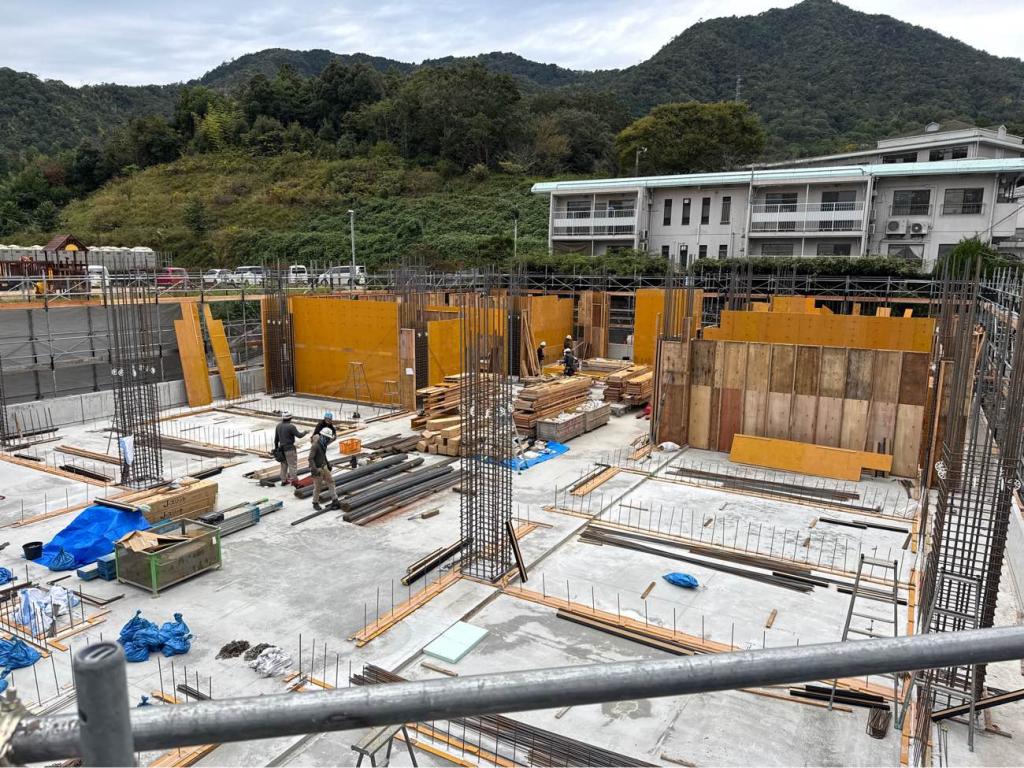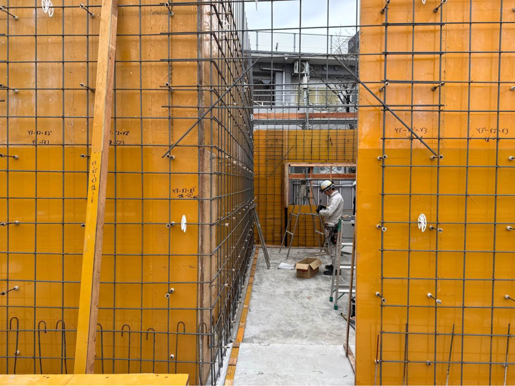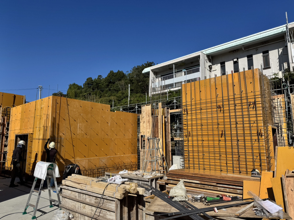 いよいよ1階の躯体工事が本格化してきました。 B1階および1階床のコンクリート打設が無事に完了し、現在は1階の型枠建て込みと壁の配筋作業が進んでいます。 今回の建物は間仕切り壁のほとんどがコンクリートとなるため、型枠や鉄筋の材料が非常に多く、これまで広く感じていた現場も、一時は材料置き場に悩むほどの状態に。 そんな中でも、職人さん同士が協力し合い、材料の搬入タイミングや置き場、作業スペースの確保について話し合い、作業はとてもスムーズに進んでいます。 限られたスペースを協力してコンパクトに整理整頓しながら進める姿が、現場全体の士気を高めているように感じます。 なお、次回のコンクリート打設は2回に分けて打設するため、しっかりと打ち継ぎ部の処理も行い、次回の作業に備えています。 次回の1階コンクリート打設は12月2日と4日を予定しています。 これからますます寒くなる時期ではありますが、安全第一で、引き続き丁寧な施工を進めてまいります!