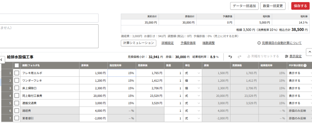 協力会社からはいろんな書き方で見積が届きます。単価は定価で書かれているが仕切り値(卸値)で大きく値引されているもの、駐車場代などお客様への見積には反映したくない細かな経費が計上されているものなど。