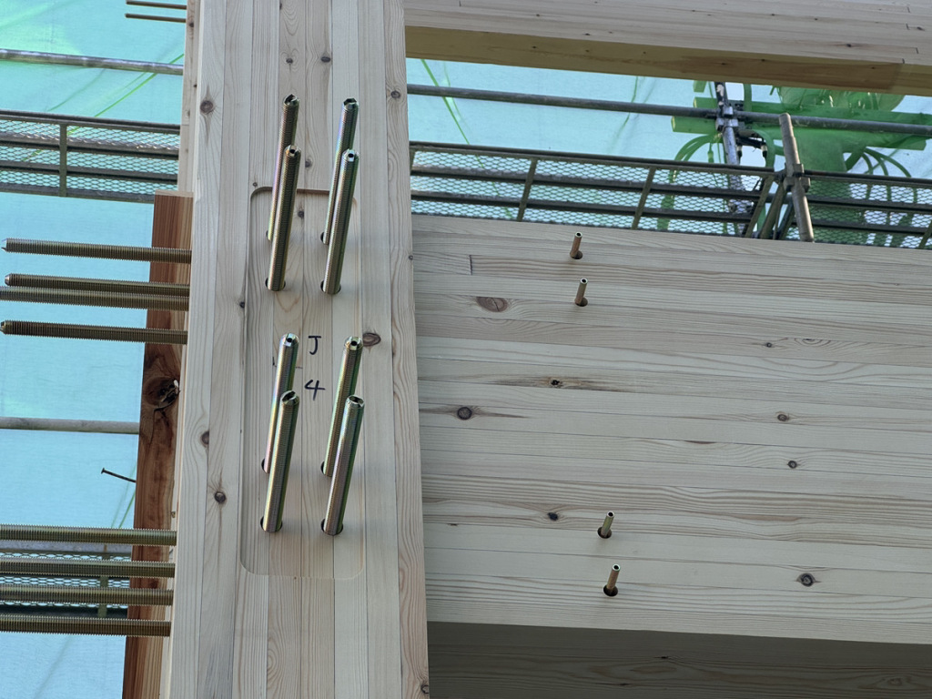 今回行われているのは、ホームコネクターという金物を用いた木造のGIR(グルードインロッド)接合という工法です。