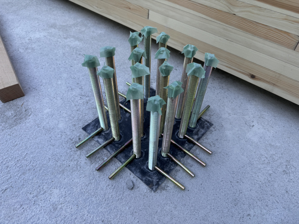 これが柱を支える中空ボルトです。内部に水が入らないよう仮養生してあります。このように中空ボルトと中空ピンが接続され、中空ピンから接着剤を注入していくとボルト上部から溢れてきて、ボルト挿入孔に充填されます。